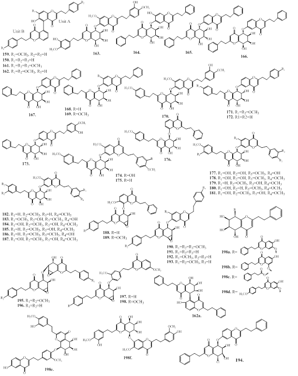 The sesquiterpenoid D8 (Figure 6) reported as inhibitor of innate and adaptive immunity through suppressing the STAT signaling pathway [184]. The PECs 18, 65, 75 (Figure 14), and 158 (Fig. 17), showed ABTS•+ radical scavenging activity, with IC50 values of 34.7, 16.5, 12.1 and 12.3 µM, respectively [92]. The A. sinensis PEC compound 136 (Figure 16), suppressed the survival, activation, proliferation, and differentiation of B cells through reduced B-cell activating factor from the tumor necrosis factor family (BAFF) signaling [185]. The PEC compounds 16, 44 and 82 (Fig. 14), showed the tyrosinase inhibitory activity [75,103]. The ethanolic extract of agarwood produced by the whole-tree agarwood-inducing technique, improved the intestinal peristalsis, enhanced gastric emptying, and inhibited gastric ulcer [175]. Additionally, agarwood ethanol extract showed protective effect of intestinal injury induced by fluorouracil (5-FU) through reduced inflammation and, enhanced antioxidant enzymes and Nrf2 signalling [186]. The alcoholic extract of Agar-Wit agarwood alleviate the inflammation and asthma in the asthma mouse model induced by intraperitoneal injection of ovalbumin+Al(OH)3 [187]. The agar wood decotions/infusions traditionally used for alleviating abdominal discomfort, however the gastrointestinal effect on a specific disease is not completely explored yet.