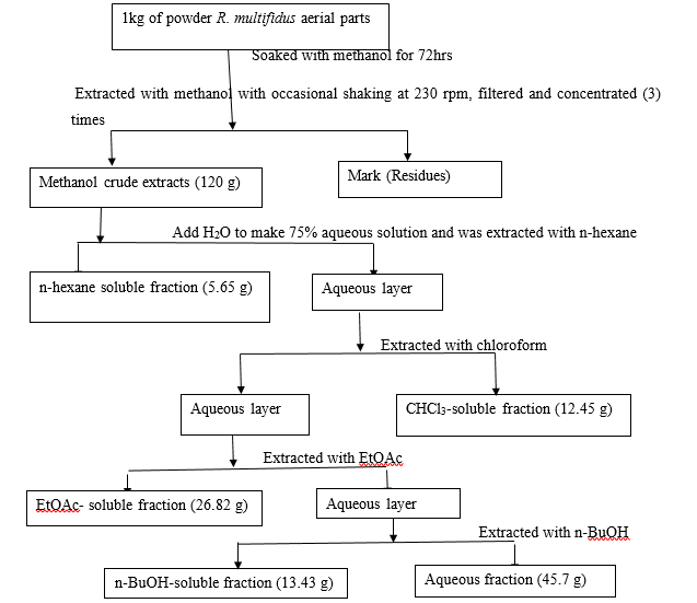The air-dried aerial materials (1kg) of R. multifidus were milled into powder and extracted with 6 L of methanol for 72 hours with occasional shaking at room temperature using an orbital mini shaker at 230 rpm. The extracts were filtered and concentrated under reduced pressure using a rotary evaporator at 40 °C, leaving behind the methanolic extract (120g). Using liquid-liquid partitioning techniques, the methanolic extracts were fractionated using different solvents, starting from non-polar to polar solvents, according to Khan [17] with slight modifications. In the process, the methanolic extract was suspended in water and partitioned successively into n-hexane, chloroform, ethyl acetate, and n-butanol. The whole procedure of liquid-liquid fractionation is depicted in (Figure 2). Each fraction of solvents concentrated under reduced pressure using rotavapor and aqueous phase concentrated using lyophilizes to dry after putting overnight in a deep freezer at -20 °C to afford 4.54, 10.87, 26.27, 15.15, and 38.08%, respectively.